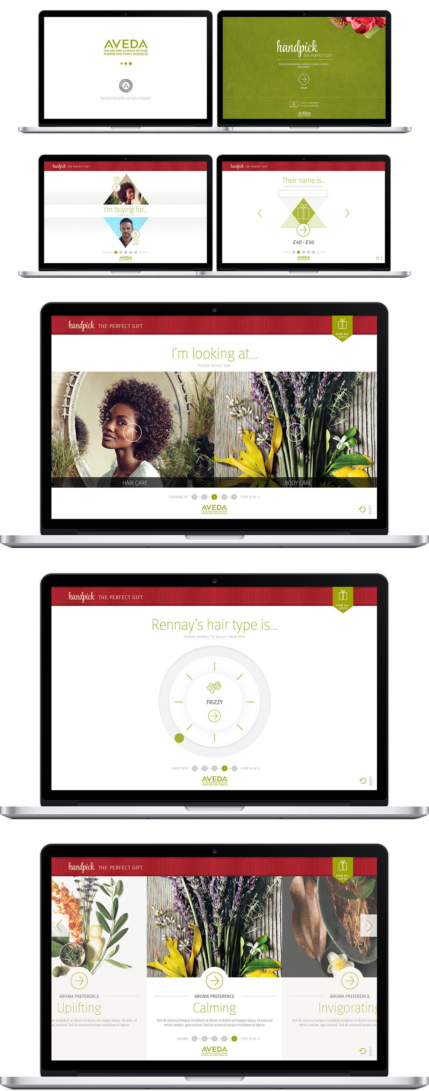 UI and UX Design for a responsive AVEDA Gift Finder solution (including emailer designs).